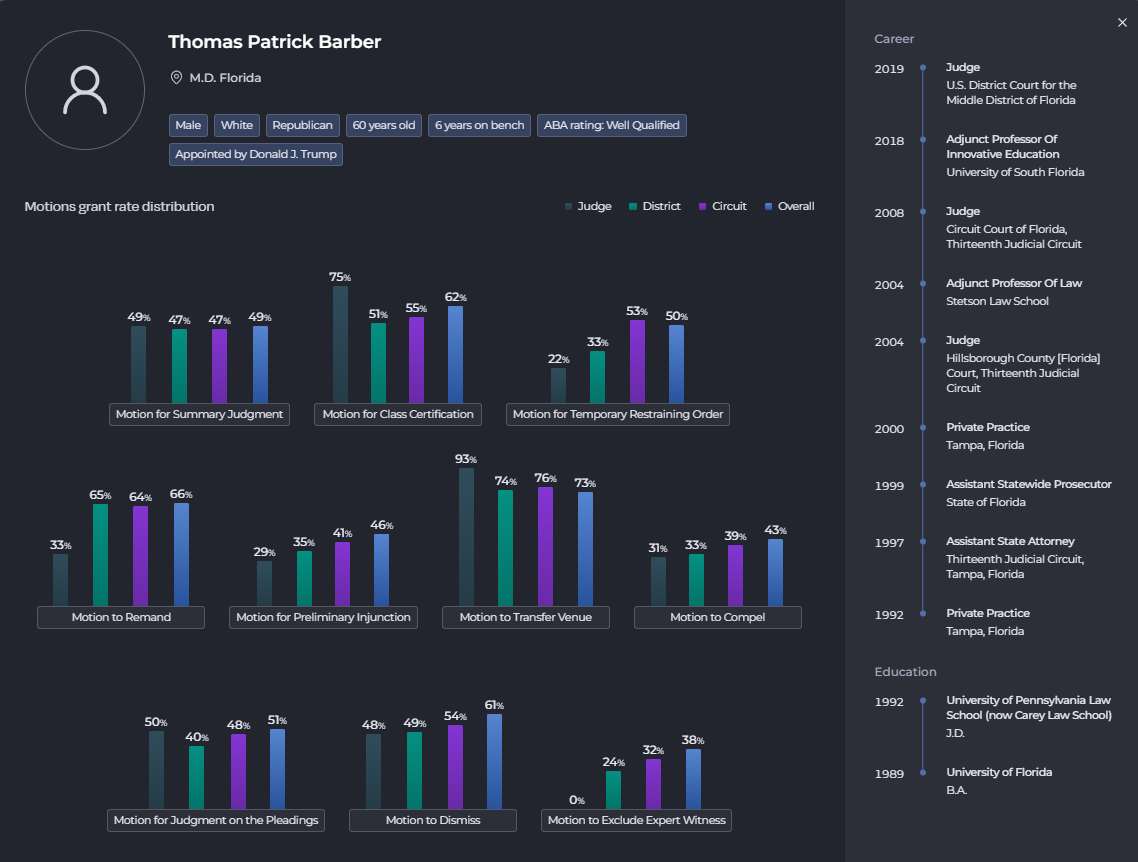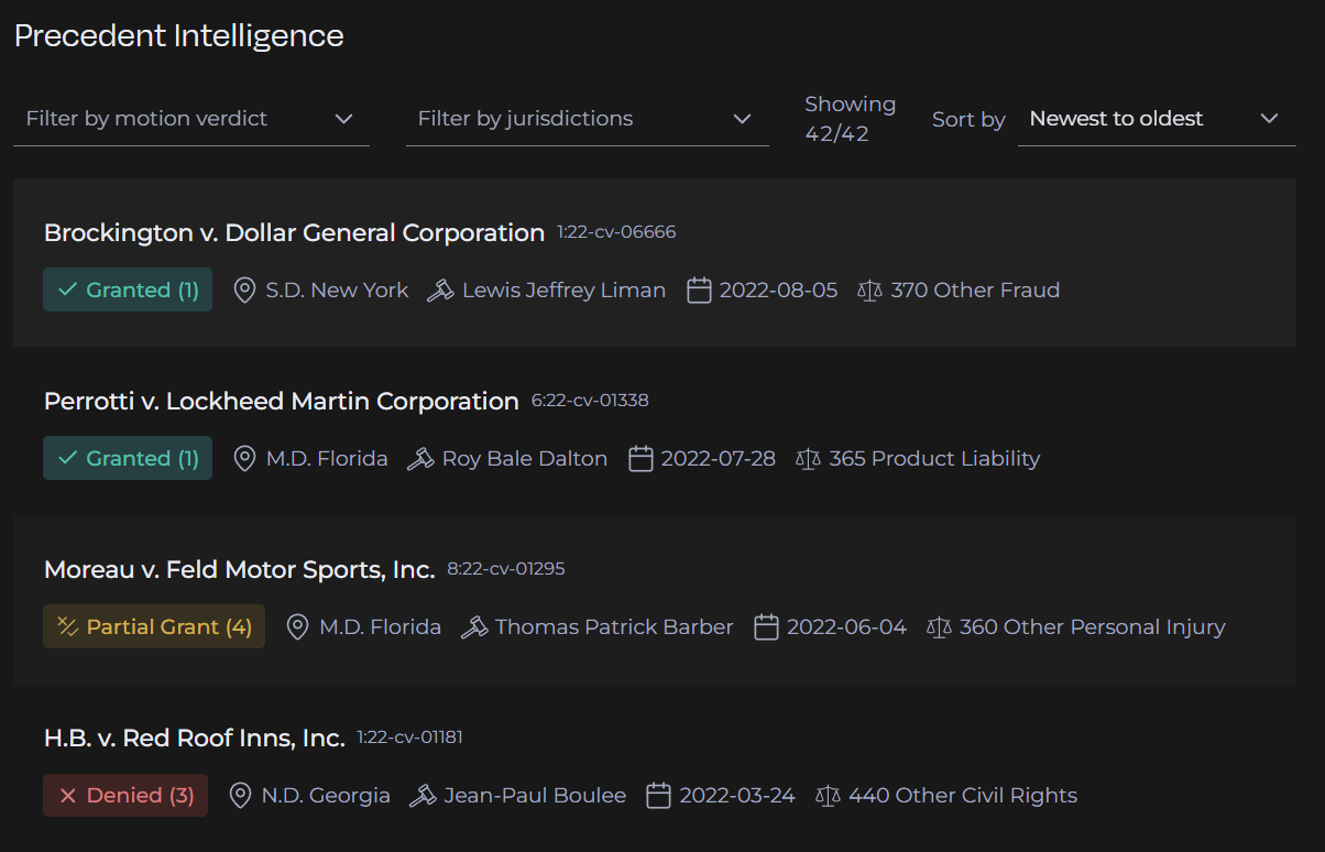 Case-specific judicial intelligence grounded in historically comparable matters. See how courts have ruled, and how your case is statistically positioned to progress, based on the actual composition of your judge, parties, counsel, and claims.