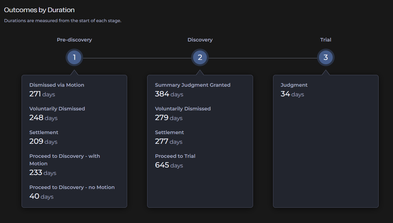 From filing to resolution, see how long comparable cases have taken, so you can staff, budget, and advise clients with historical grounding.